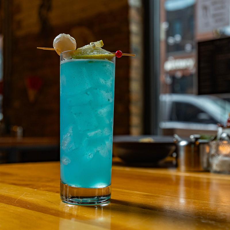 Our own take on the China Blue -white rum, lychee, blue curacao, lemon.