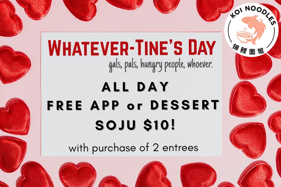 Free app of your choice or dessert with 2 entrées. Optional Soju Bottle add-on for $10. Feb 14 • Dine-in only.